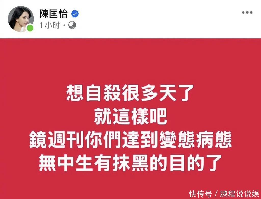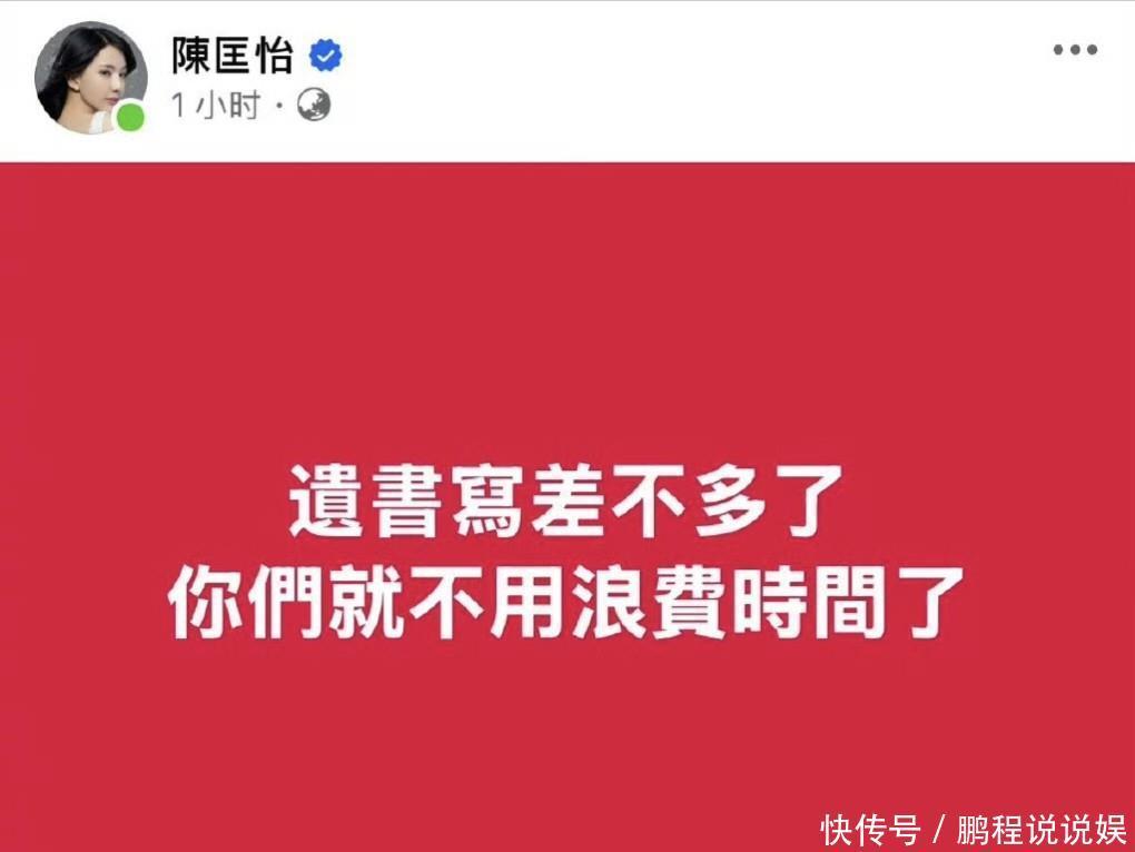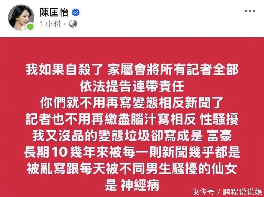 今日,陈匡怡言辞激烈,似乎受了什么刺激。连发多篇文章表示自己有自杀念头。她先是表示自己如果自杀了,家属会告所有曾经乱写的记者。