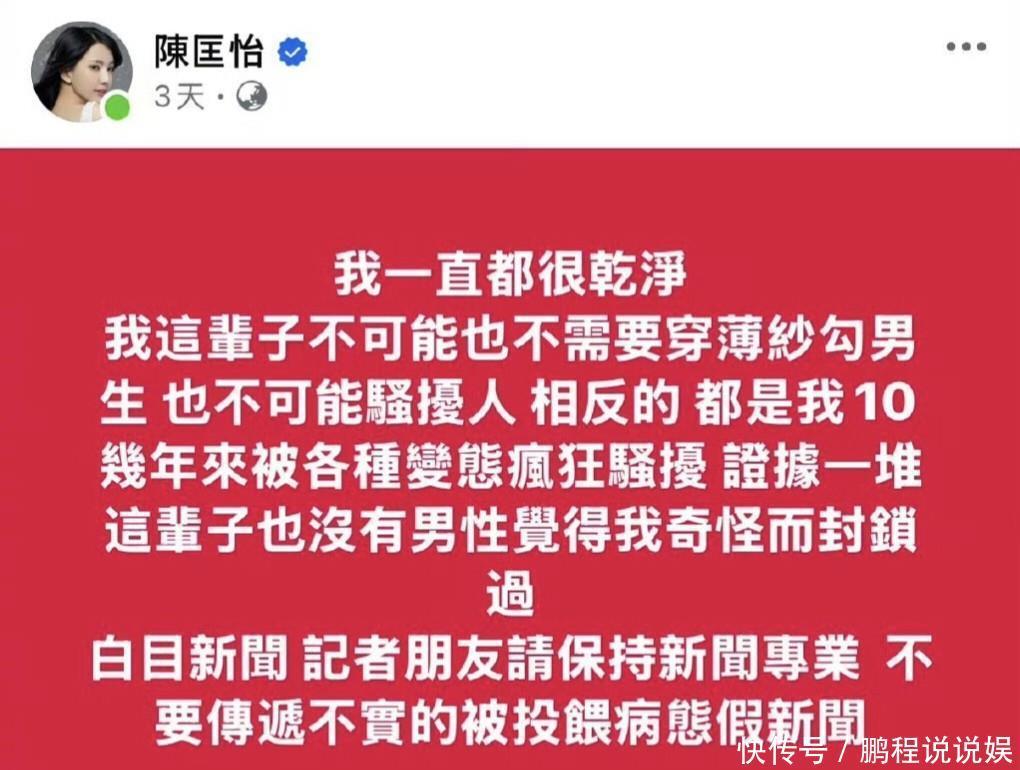 三天前,陈匡怡在社交媒体上发表文章控诉记者,她直言自己一直很干净,不可能骚扰别人,那些新闻都是假的。